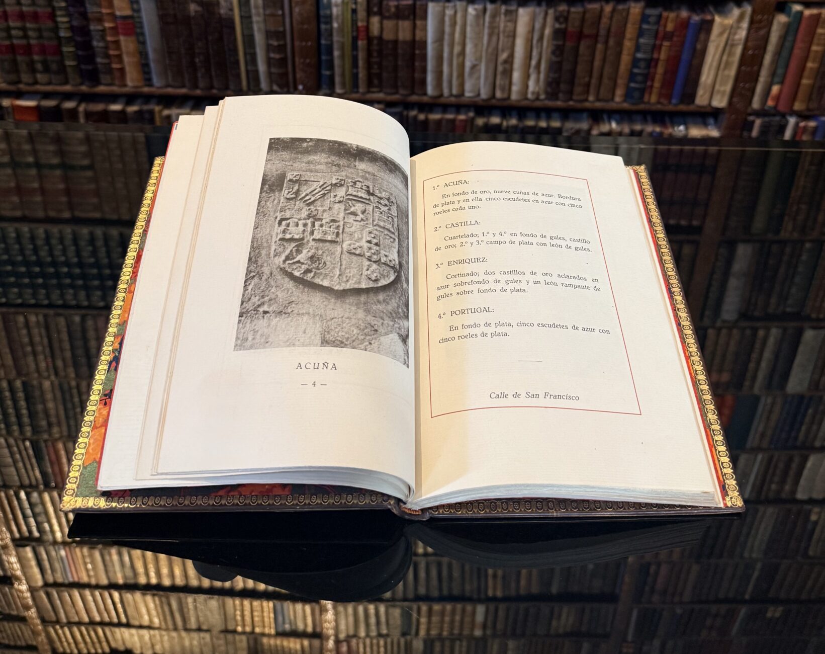 El libro recopila y documenta exhaustivamente los escudos heráldicos conservados en fachadas, portadas, iglesias, palacios y edificios históricos de León. Incluye descripciones detalladas de cada blasón (colores, figuras, particiones), ubicación exacta en la ciudad y, cuando es posible, identificación de la familia o linaje nobiliario al que pertenece.