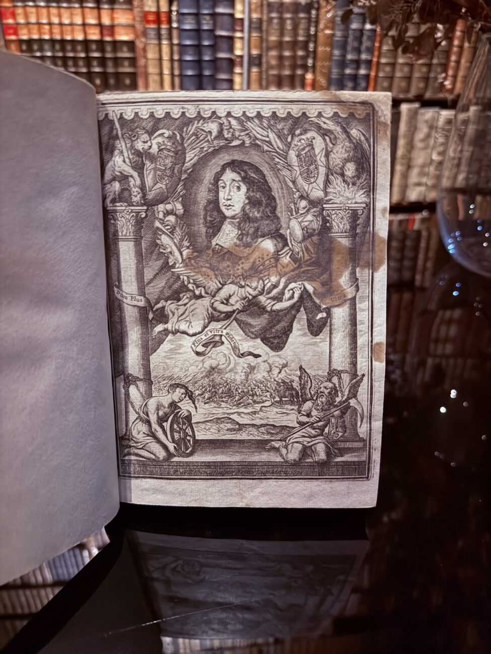El frontis grabado es un retrato de D. Juan de Austria en el marco de una batalla campal, flanqueado por dos pilares con la leyenda “Dum Plus Ultra. Plus et Ultra videtur”.