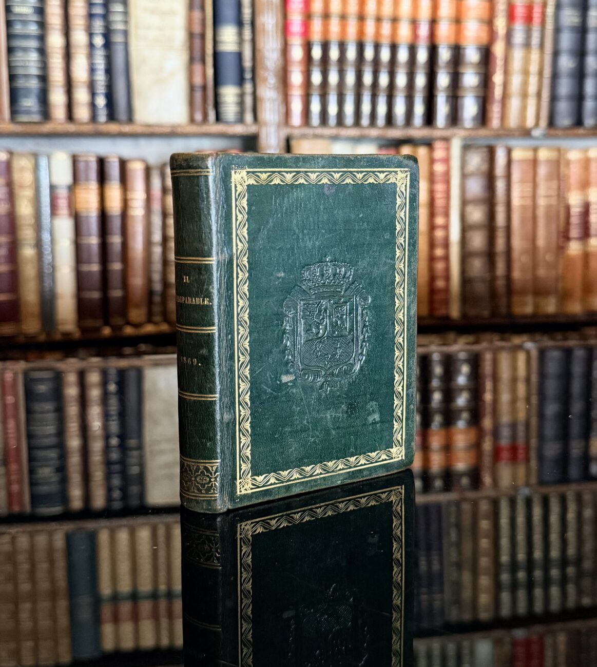 12º (124 x 88 mm.) Encuadernación romántica en marroqueen verde con greca dorada en ambos planos enmarcando supralibris gofrado en seco con el escudo de España. Lomo liso con hierros y ruedas doradas.
