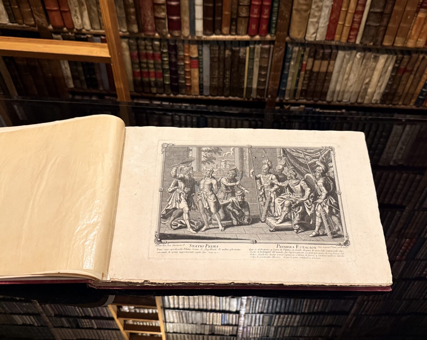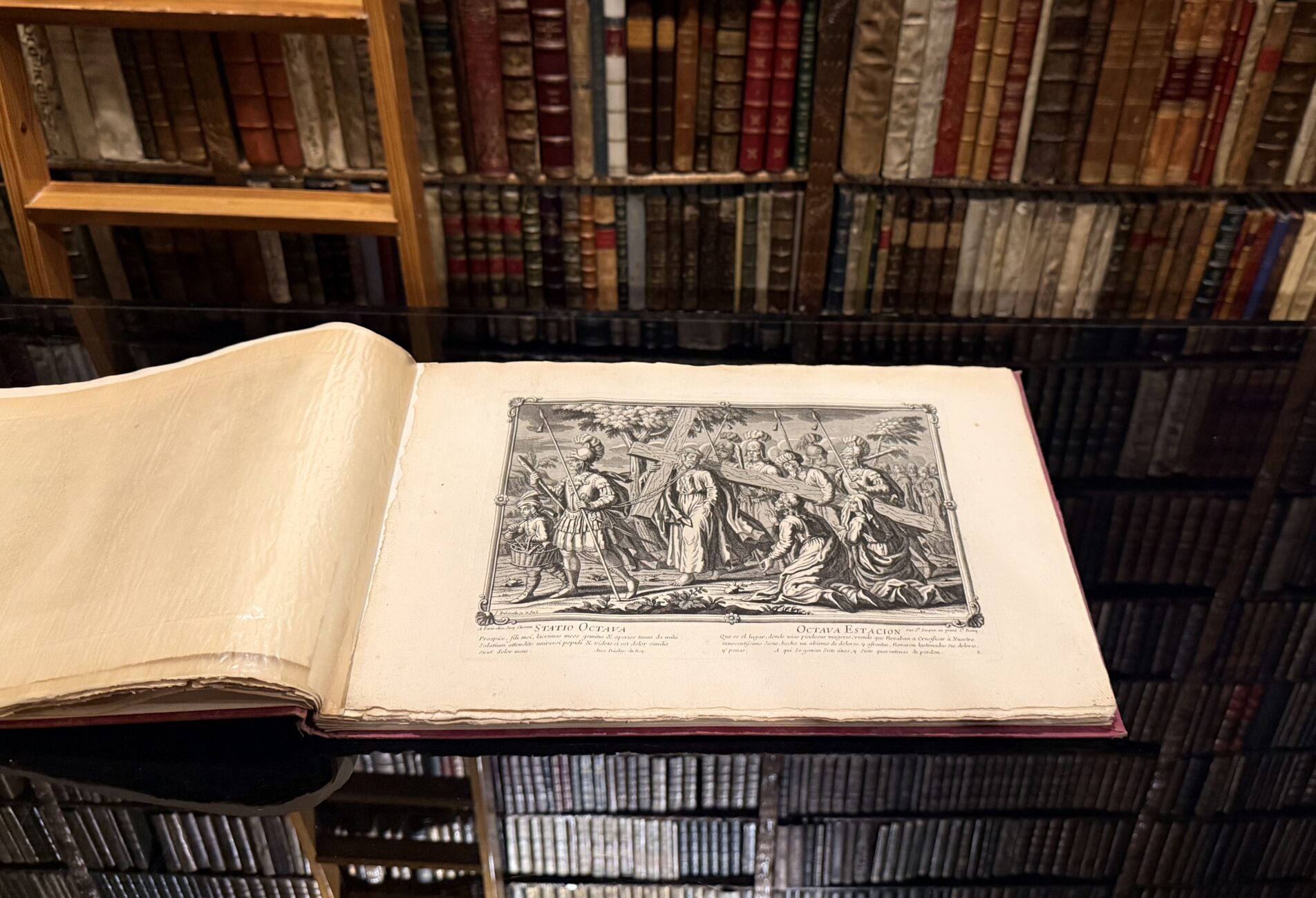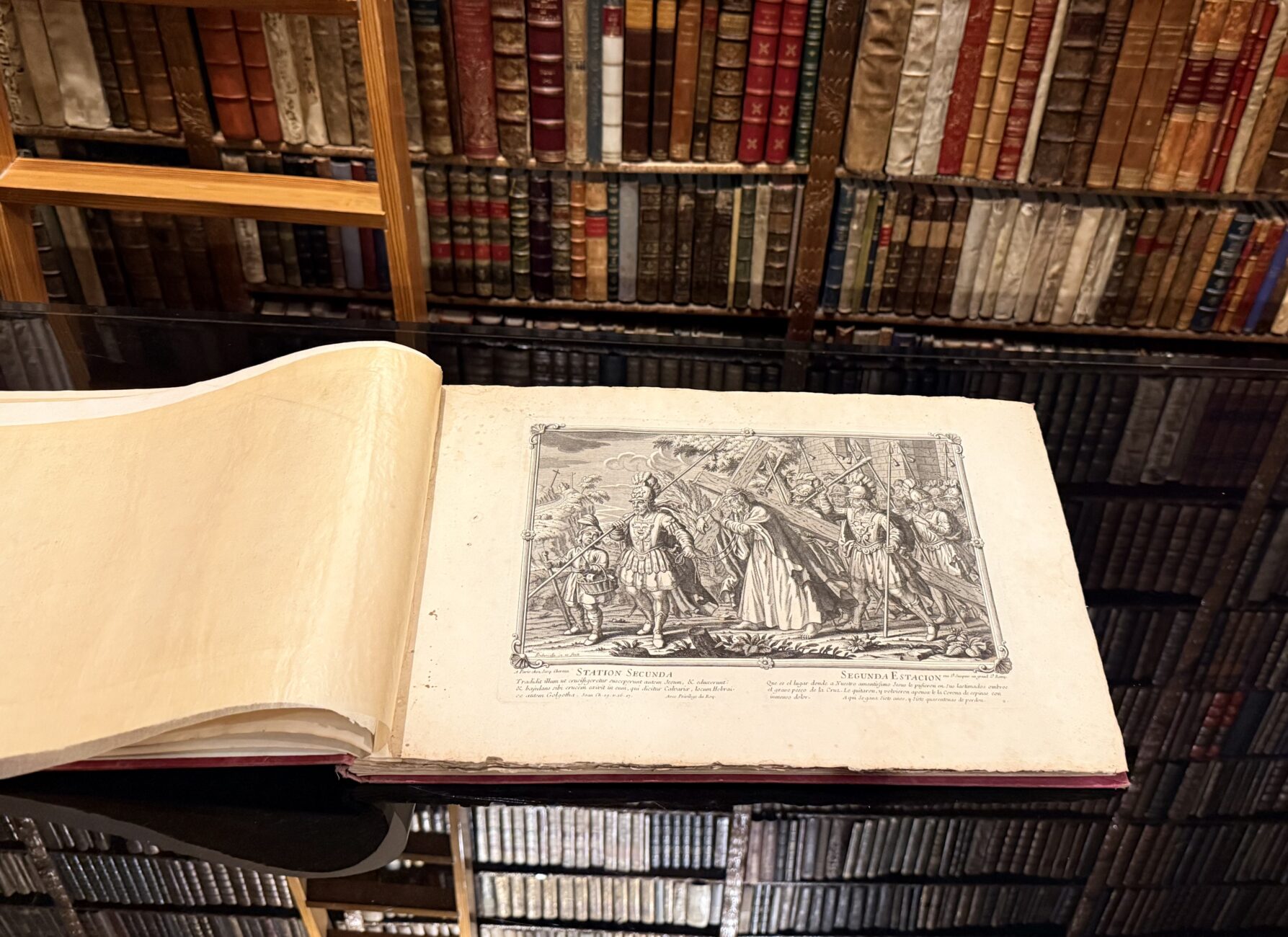 Magnífica serie grabada por el pintor y grabador francés François Philippe Dubercelle, activo en París en la primera mitad del siglo XVIII. Representa las 14 estaciones del Vía Crucis, con títulos al pie en latín y castellano, cita evangélica en latín y explicación devocional en castellano.