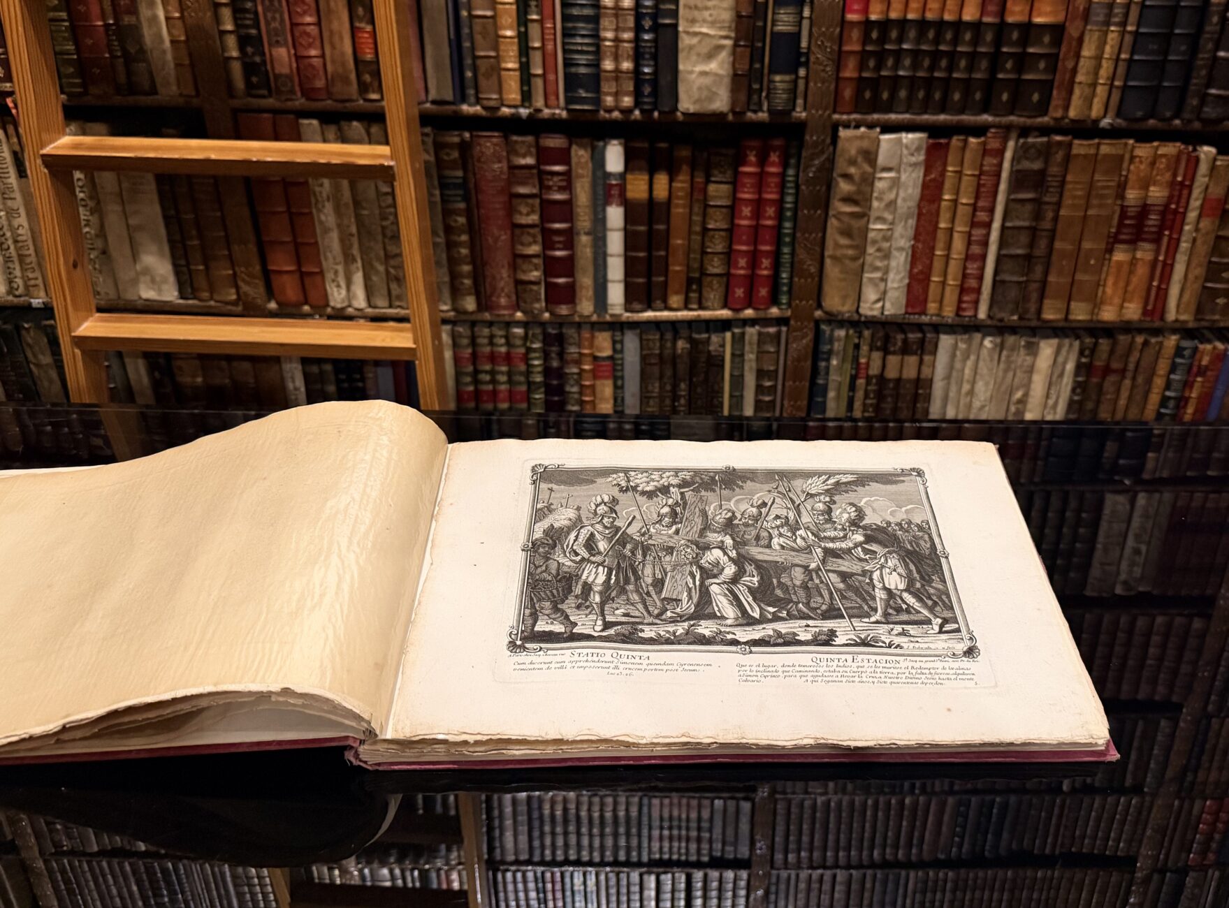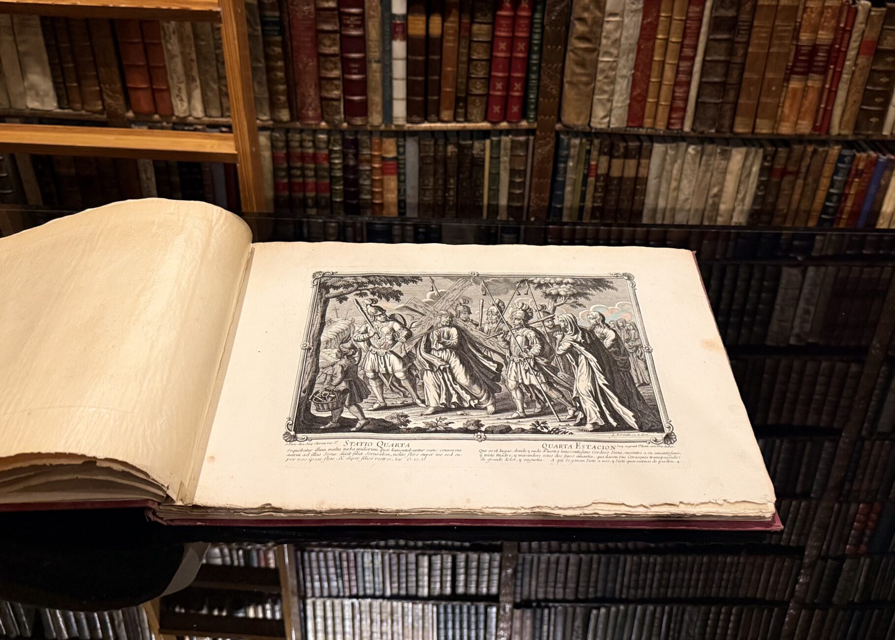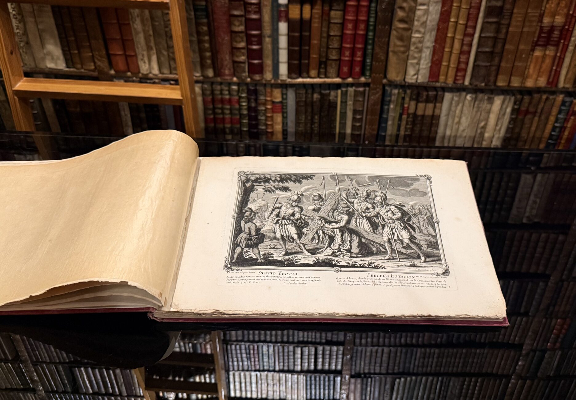Magnífica serie grabada por el pintor y grabador francés François Philippe Dubercelle, activo en París en la primera mitad del siglo XVIII. Representa las 14 estaciones del Vía Crucis, con títulos al pie en latín y castellano, cita evangélica en latín y explicación devocional en castellano.