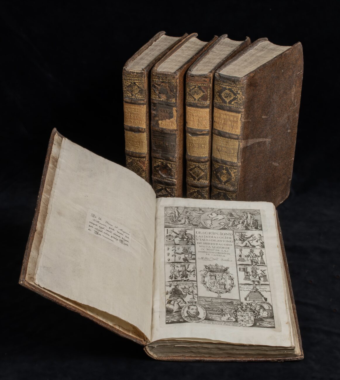 5 vols. Folio (305 x 201 mm.) Contemporary calf, spines gilt in compartments (somehow worn, specially on vol. 2 and 3). Engraved title page for each decade, 14 engraved folding maps. Printed in two columns, woodcut initials and vignettes.