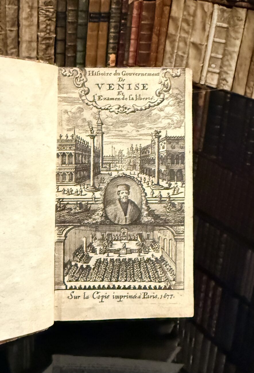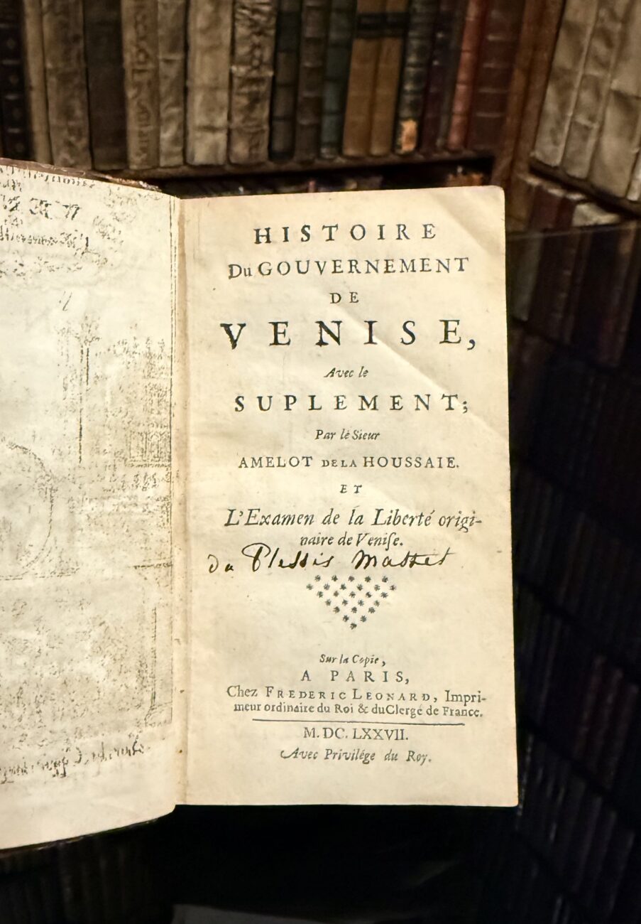 Segunda edición francesa de este clásico de la teoría política e institucional de la República de Venecia. Houssaye, que residió allí como secretario de la embajada francesa, describe detalladamente el funcionamiento del gobierno: el Gran Consejo, el Senado, el Consejo de los Diez, la Inquisición, los magistrados y los mecanismos del poder oligárquico.