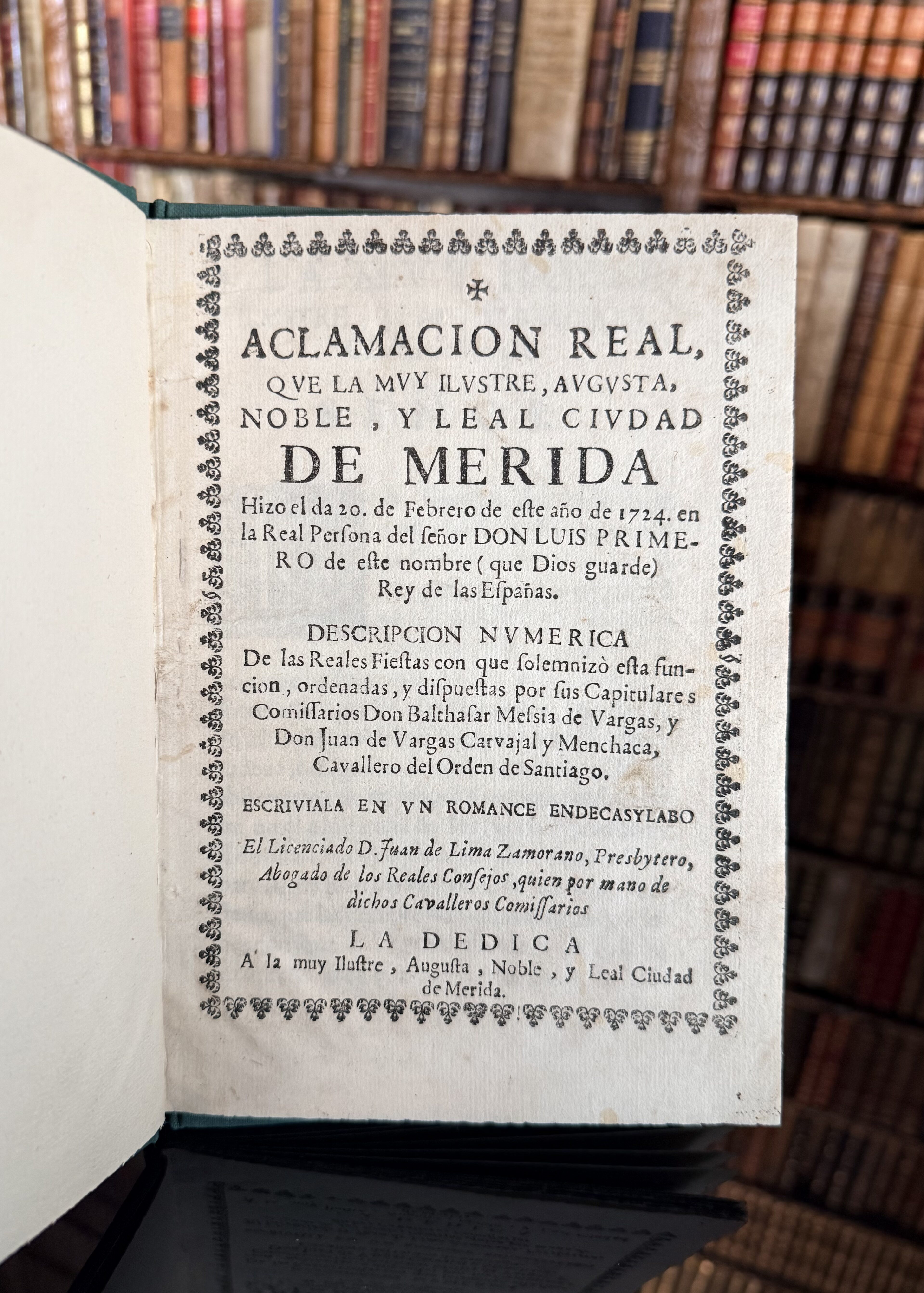 Aclamacion real, que la muy ilustre, augusta, noble, y leal ciudad de Merida hizo el da 20 de Febrero de este año de 1724 en la Real Persona del señor Don Luis Primero de este nombre (que Dios guarde) Rey de las Españas. Descripcion numerica de las fiestas con que se solemnizò esta funcion, ordenadas y dispuestas por sus Capitulares Comissarios Don Balthasar Mesia de Vargas y Don Juan de Vargas Carvajal y Menchaca, Cavallero del Orden de Santiago.